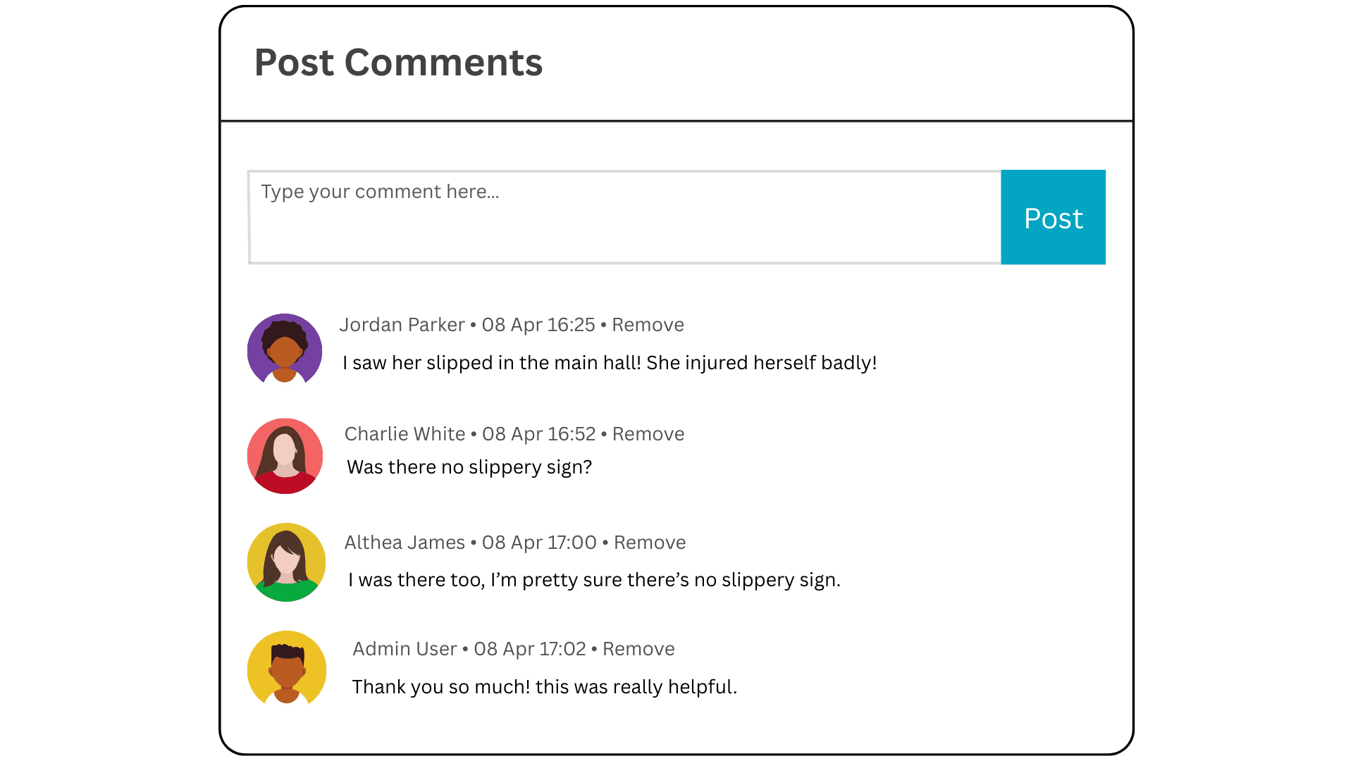 Managers, facilitators and administrators are notified on every incident that's reported, allowing them to take actions immediately such as staff delegation, adding participants and initiating online conversations to resolve them fast.